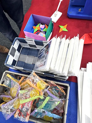 ブースでは、広告入りポケットティッシュやチラシ、会社案内のほか、七色の飴や折り紙で作った鶴や手裏剣もご用意。正直なところ、最初は「折り紙はどうなんだろう…?」という半信半疑の気持ちもあったのですが、これが意外にも大好評。