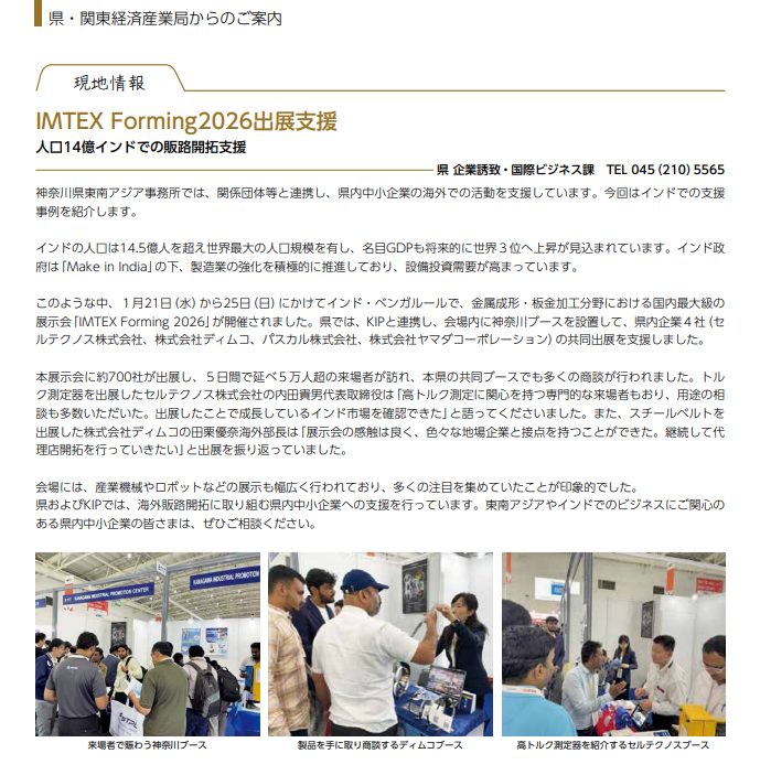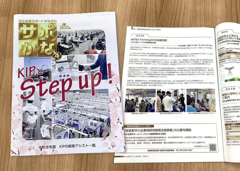 中小企業サポートかながわ情報誌「サポかな」第300号 2026年4月発行紙面にて、IMTEX Forming2026出展の様子が掲載されました。